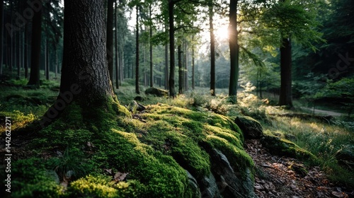 © PBMasterDesign, Fototapeta premium Green moss with relax mood in green forest concept. Sunlight filters through lush forest trees.