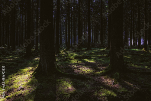 © atosan, Fototapeta premium Green mossy forest floor with trees.