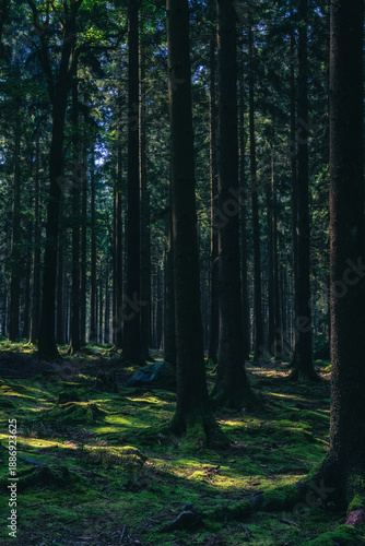 © atosan, Obraz premium Green mossy forest floor with trees.