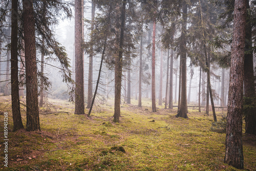 © Thomas Lemmer, Fototapeta premium Green mossy forest in winter fog with wet tree trunks and a cold moody atmosphere