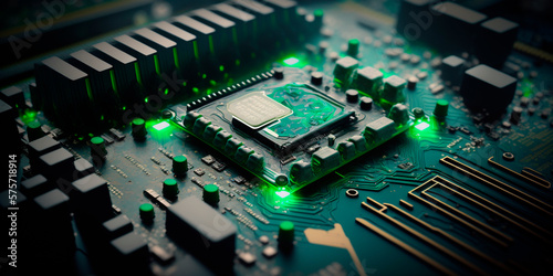 Obraz premium Green Motherboard Close-Up with Processor, Bokeh Effect