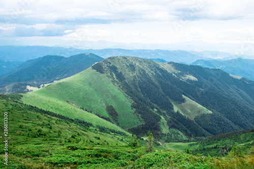 Fototapeta premium green mountain Carpathians ridge, low clouds