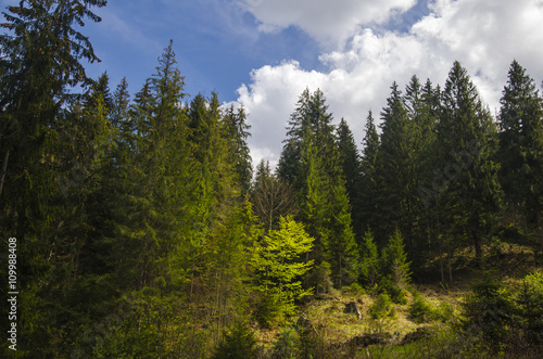 Obraz premium Green mountain forest in the light of summer sun