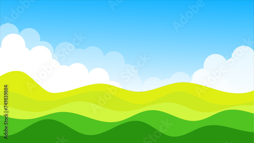 © Khalil, Obraz premium Green Mountain landscape lawn view with white clouds and blue clear sky background vector illustration.