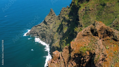 Fototapeta premium Green mountain landscape on ocean coastline, hiking trail in Anaga rural park. Chinamada Tenerife Canary Islands Spain.