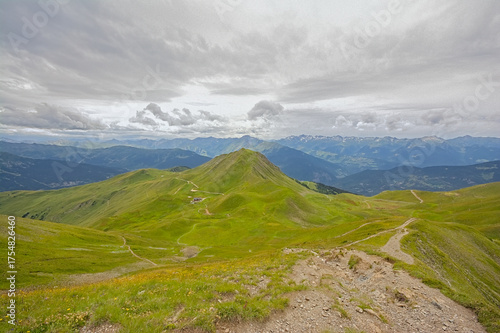 Fototapeta premium green mountain landscape under a cloudy sky in La Vanoise nature reserve,...