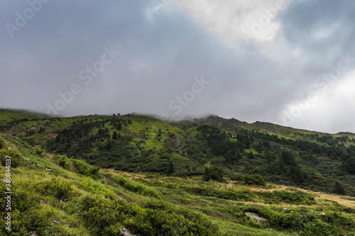 Naklejka premium green mountain landscape with rainclouds while hiking