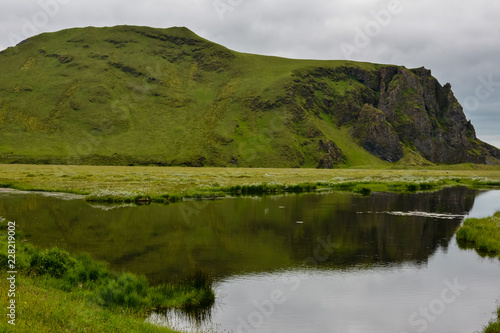 © janaland, Obraz premium Green mountain reflecting in calm water on overcast day in Iceland