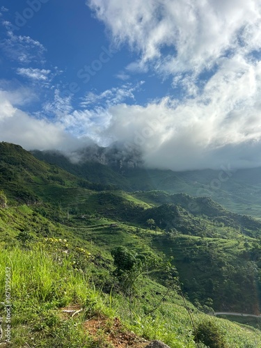 Fototapeta premium green mountain rice fields landscape sunshine with clouds