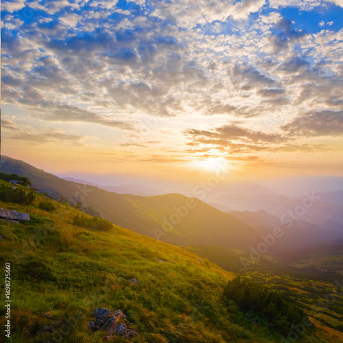 © Yuriy Kulik, Naklejka premium green mountain valley in blue mist at the sunrise, green mountain at the early morning
