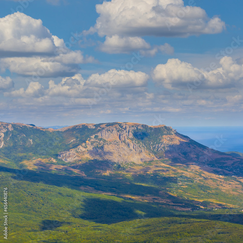 © Yuriy Kulik, Obraz premium green mountain valley under dense clouds