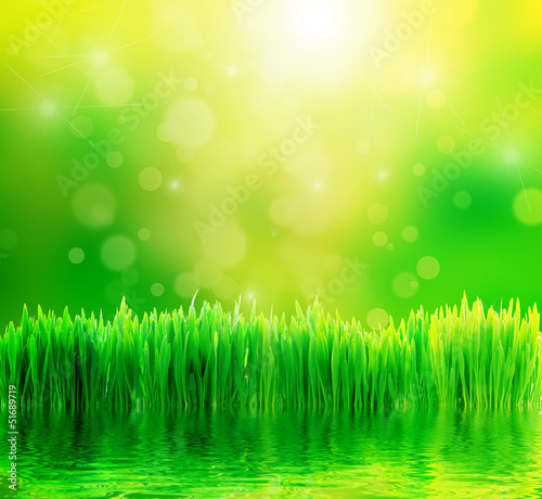 Obraz premium Green nature background with fresh grass and water