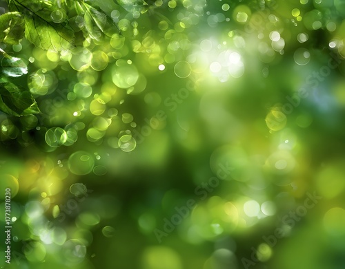 Obraz premium Green Nature Bokeh Background with Sunlight and Leaf Blur for Fresh Organic...