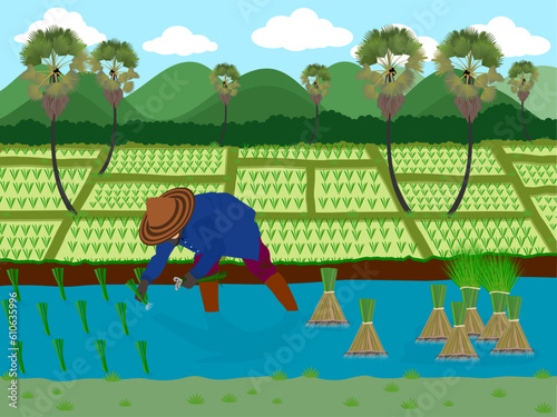 © meechai39, Obraz premium Green nature landscape with Paddy jasmine rice field in thailand.