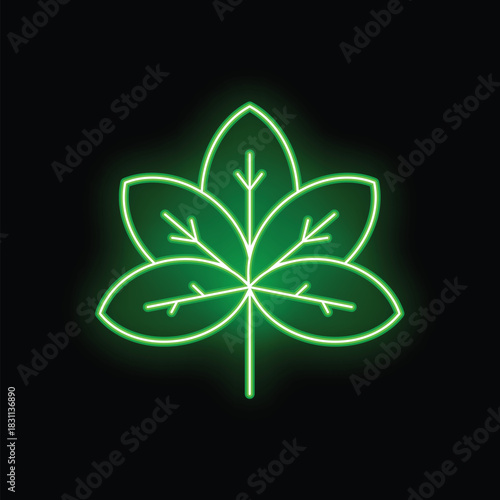 Naklejka premium Green neon leaf glowing on a black background representing nature, growth, and sustainability