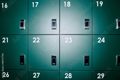 Fototapeta premium Green numbered lockers arranged in grid pattern occupying modern business...