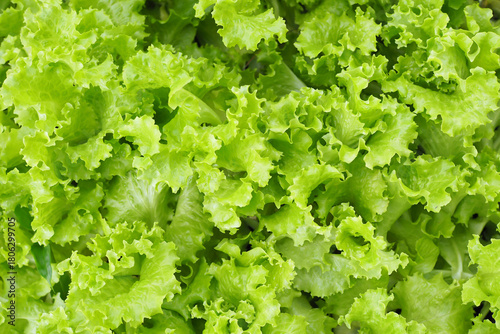 © apimook, Fototapeta premium Green Oak Lettuce Texture Background, Close-Up of Organic Green Oak Salad Leaves