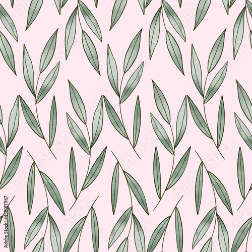 Naklejka premium Green Olive Leaves Branches on Pink Background Watercolor Seamless Pattern