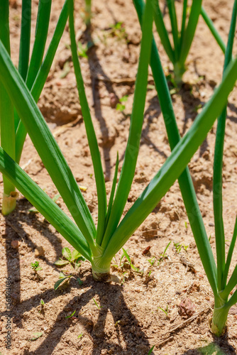 © Olesya, Obraz premium Green onions grow in a row in the ground.
