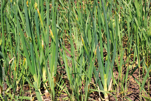© irisff, Fototapeta premium Green onions growing in garden on sunny spring day. Texture of greenery