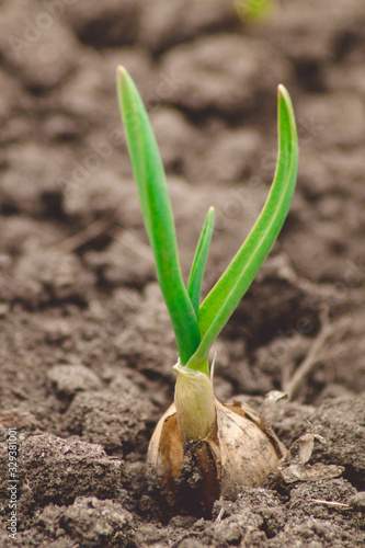Fototapeta premium Green onions sprout in the field.