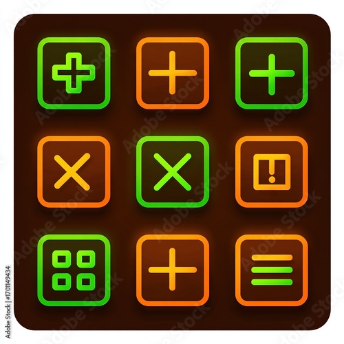 © Taylor, Obraz premium Green Orange UI Control Icons Set with Plus Minus Exclamation Menu, Web Application Interface Elements, Interactive Design Function Button Group
