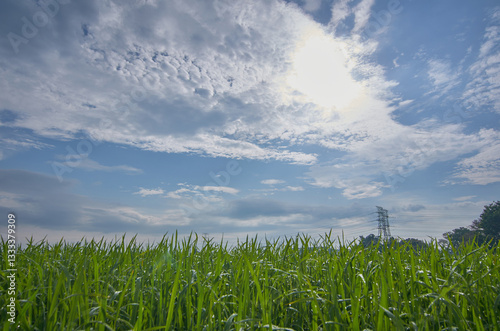 © BH, Fototapeta premium green paddy field with beautiful blue sky