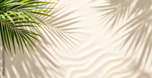Obraz premium Green palm leaves casting soft shadows on a bright beige background. Light...