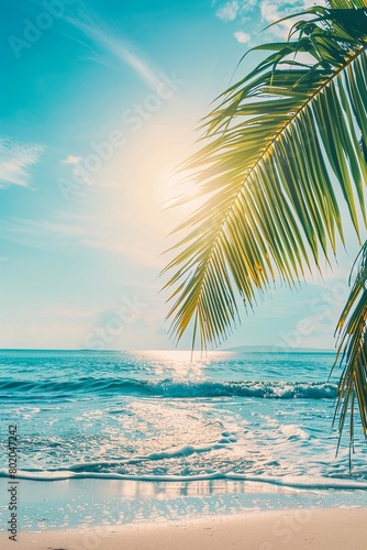 Obraz premium Green palm leaves contrast with the sandy beach in the background. For summer...