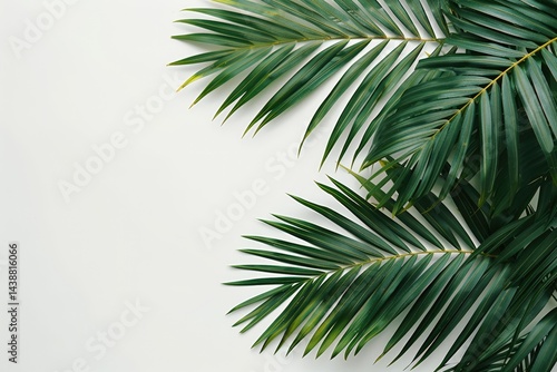© Molly P, Naklejka premium Green palm leaves on a white wooden background. Background image of green tropical leaves with white texture. Flat lay tropical composition with copy space. Botanical wallpaper design concept. AIG51.