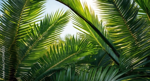 Fototapeta premium Green palm leaves under sunlight creating a vibrant tropical foliage...