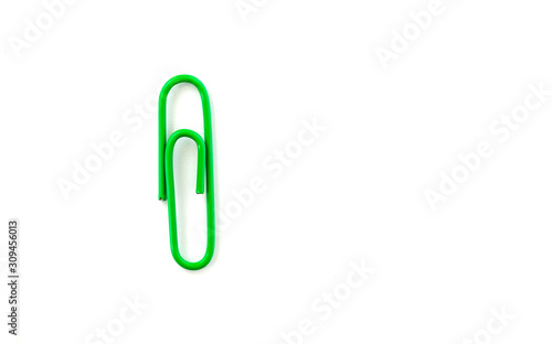 Obraz premium Green paper clip isolated on white background. Close up and top view.
