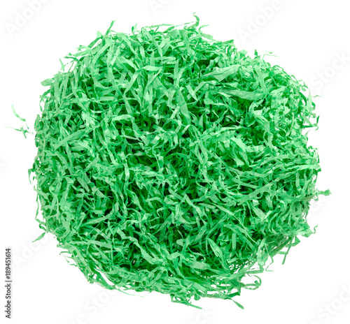 © Peter Hermes Furian, Fototapeta premium Green paper Easter grass nest from above. Colored crinkle grass. Gift basket shred and filler. Decoration.