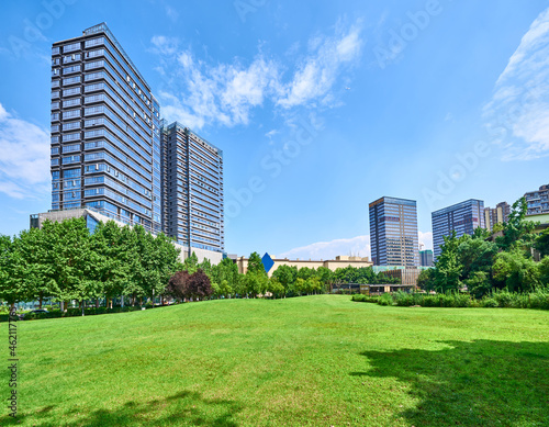 © kody_king, Obraz premium Green park developed in front of tall buildings