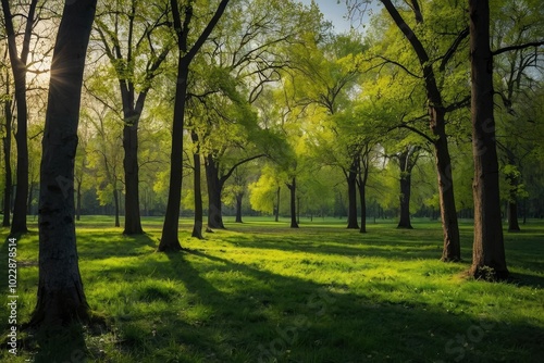 © Younes, Naklejka premium Green park landscape showing deciduous trees with fresh green foliage at springtime and sunny day in panoramic view. Trees with fresh green leaves in the park