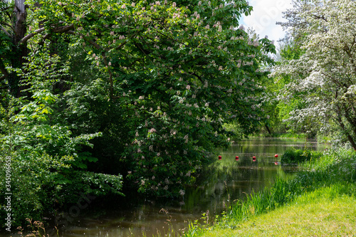 © barmalini, Obraz premium Green park with ponds and old water mill in central part of Eindhoven city, North Brabant, Netherlands in spring time.