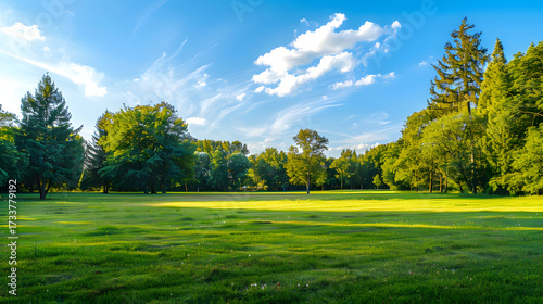 © fwetr, Fototapeta premium Green park with trees and blue sky