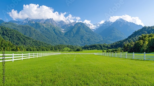 Fototapeta premium Green pasture, white fence, mountain backdrop, sunny day, landscape photography