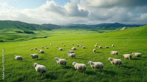 Fototapeta premium Green pasture with grazing sheep