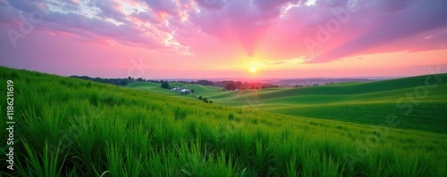 © methinee, Obraz premium Green pastures stretch far in distance at dusk, greenery, grass, pink