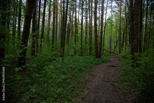 © Anastasia.photoyoga, Fototapeta premium Green path in the forest with fallen tree after rain. Natural colors