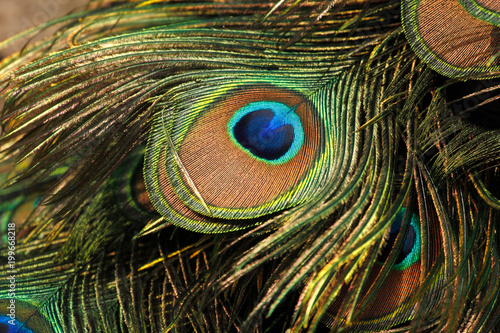 Fototapeta premium Green peafowl / peacock (Pavo muticus) eyespot on tail feathers (shallow dof)