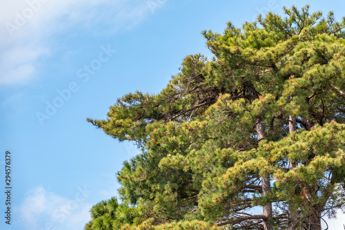 © Dmitrii Potashkin, Obraz premium Green pine branches against a bright blue sky.
