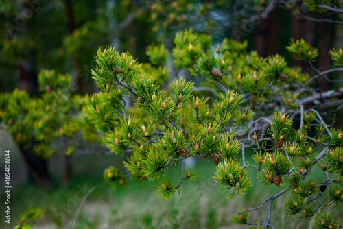 Fototapeta premium Green Pine Branches with Young Cones in a Forest