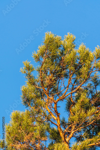 Naklejka premium Green pine tree with long needles on a background of blue sky. Freshness,...