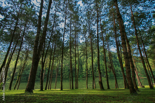 Naklejka premium green pine trees wood forest beside of small green lake in the morning sunshine