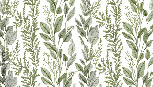 © Ai Creations, Fototapeta premium Green plant and leafs pattern. Pencil, hand-drawn natural illustration