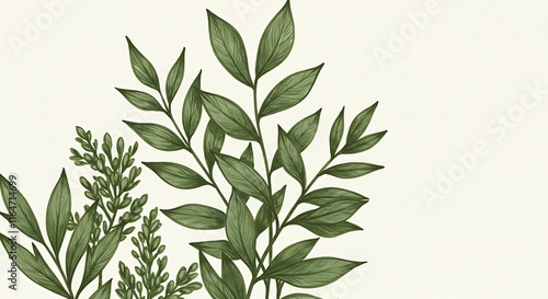 © Anomal, Fototapeta premium Green plant and leafs pattern. Pencil, hand drawn natural illustration. Simple organic plants design. Botany vintage graphic art. 4k wallpaper, background. Simple, minimal, clean design