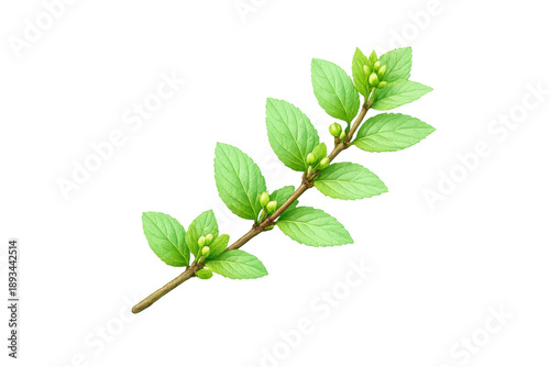 © Krtola , Fototapeta premium Green plant branch with fresh new leaves and budding flowers emerging on transparent background