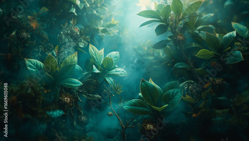 © Agus, Fototapeta premium Green plant leaves and forest background, Nature background